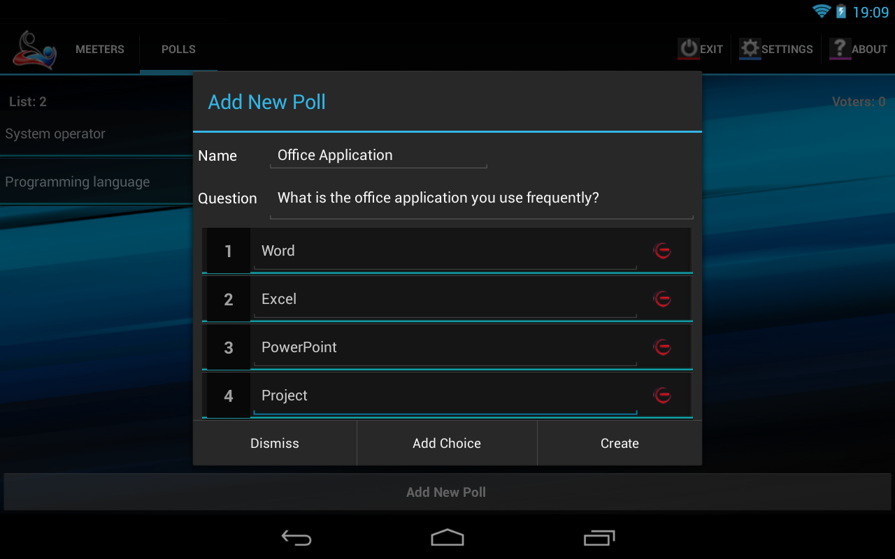 The supervisor can prepare polls or questions with choices and store them in the server database.The "Add New Poll" button on the bottom of the "Polls" panel opens a popup form where it is possible to assign a short name for the new poll, the question to submit to the meeters and a set of possible choices.